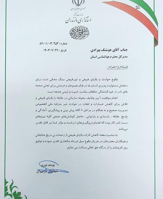 به مناسبت هفته کاهش اثرات بلایای طبیعی از زحمات بی دریغ جنابعالی و همکاران محترمتان در جریان وقوع سیل تیر ماه سالجاری تقدیر نموده و توفیق روز افزونتان را از درگاه حق تعالی مسالت می نمایم .
