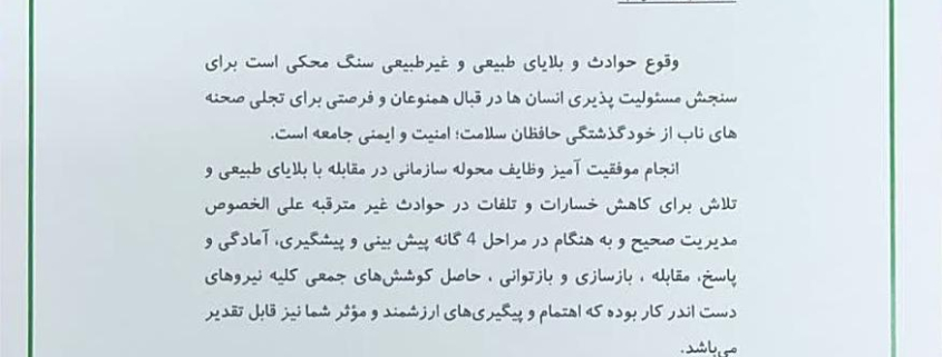وقوع حوادث و بلایای طبیعی و غیر طبیعی سنگ محکی است برای سنجش مسئولیت پذیری انسانها در قبال همنوعان و فرصتی برای تجلی صحنه های ناب از خود گذشتگی حافظان سلامت امنیت و ایمنی جامعه است. انجام موفقیت آمیز وظایف محوله سازمانی در مقابله با بلایای طبیعی و تلاش برای کاهش خسارات و تلفات در حوادث غیر مترقبه على الخصوص مدیریت صحیح و به هنگام در مراحل ۴ گانه پیش بینی و پیشگیری آمادگی و پاسخ مقابله ، بازسازی و بازتوانی حاصل کوششهای جمعی کلیه نیروهای دست اندر کار بوده که اهتمام و پیگیریهای ارزشمند و مؤثر شما نیز قابل تقدیر می باشد.