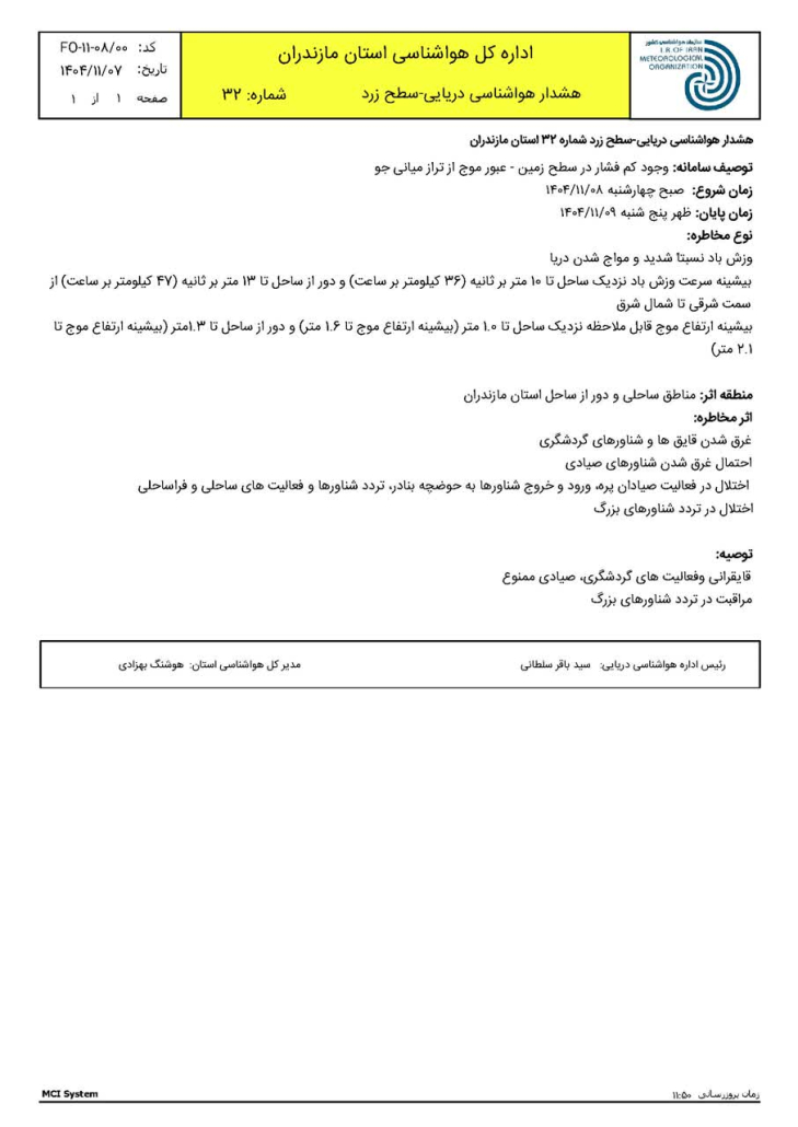 هشدار هواشناسی دریایی سطح زرد شماره ۳۲ مورخ ۰۷ بهمن ۱۴۰۴