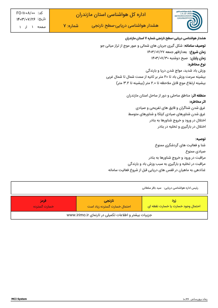 هشدار دریایی نارنجی شماره ۷ مورخ ۲۷ مهر ۱۴۰۳...