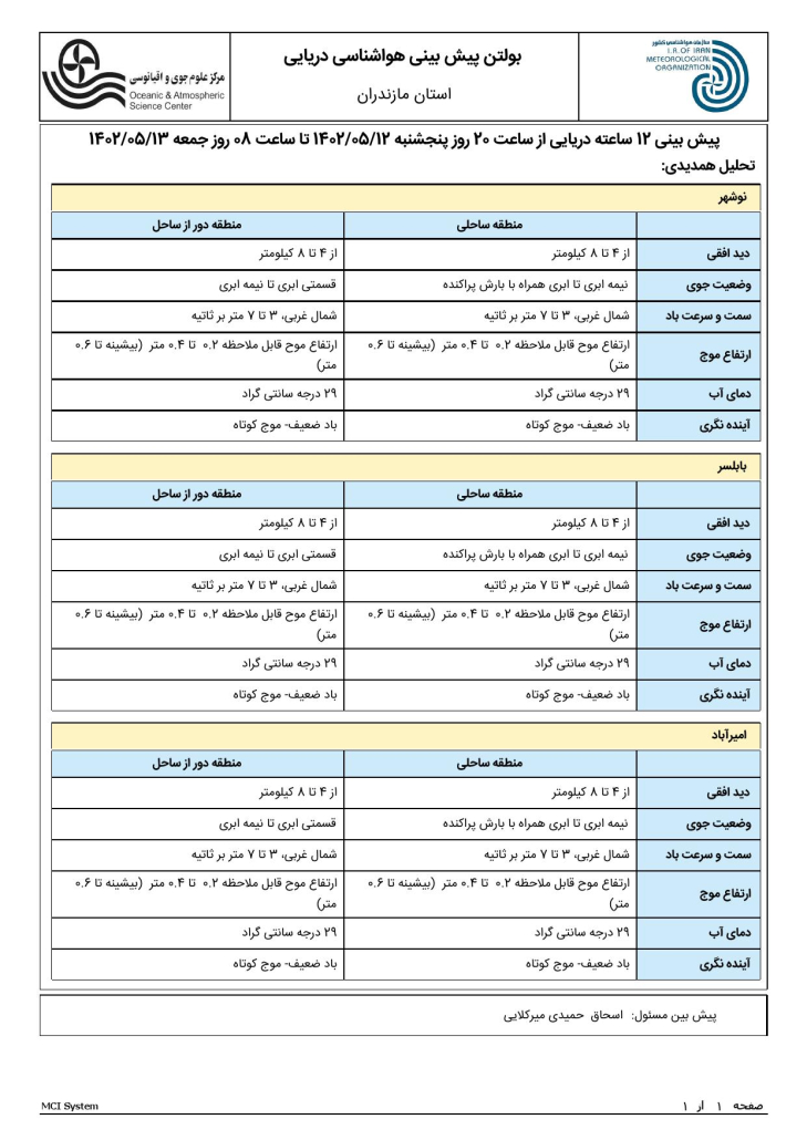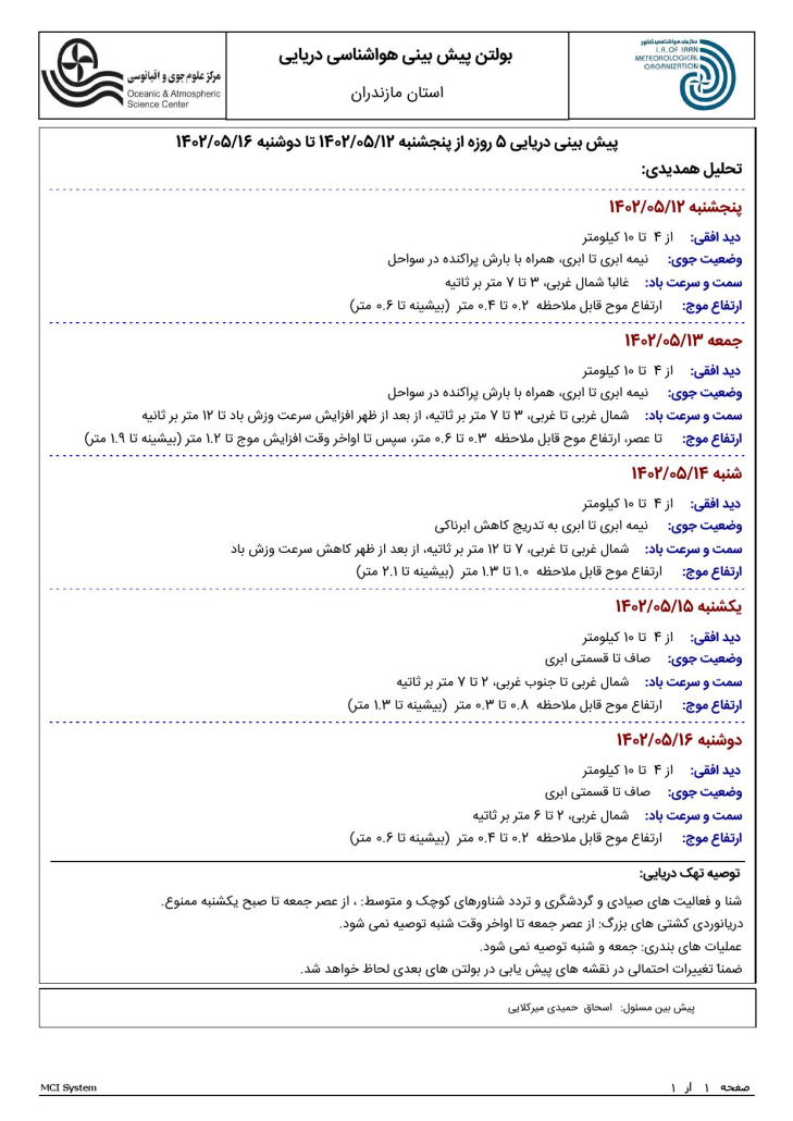 هواشناسی دریایی- پنجشنبه ۱۲ مرداد ۱۴۰۲