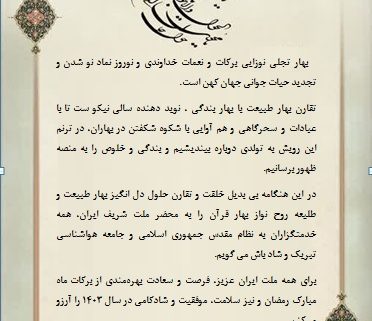 پیشاپیش در این هنگامه بی بدیل خلقت و تقارن حلول دل انگیز بهار طبیعت و طلیعه روح نواز بهار قرآن را به محضر ملت شریف ایران، همه خدمتگزاران به نظام مقدس جمهوری اسلامی و جامعه هواشناسی تبریک و شاد باش می گویم.