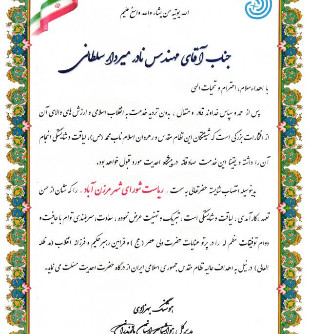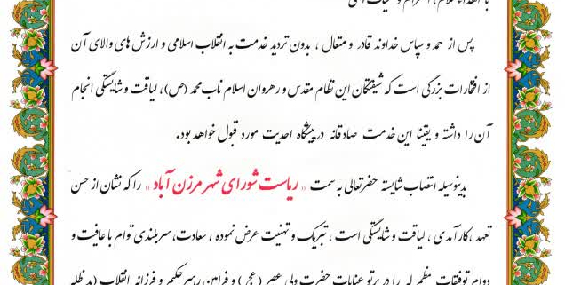 با اهداءسلام، احترام و تحیات الهی پس از حمد و سپاس خداوند قادر و متعال ، بدون تردید خدمت به انقلاب اسلامی و ارزش های والای آن از افتخارات بزرگی است که شیفتگان این نظام مقدس و رهروان اسلام ناب محمد (ص)، لیاقت و شایستگی انجام آن را داشته و یقینا این خدمت صادقانه در پیشگاه احدیت مورد قبول خواهد بود. بدینوسیله انتصاب شایسته حضرتعالی به سمت « ریاست شورای شهر مرزن آباد » را که نشان از حسن تعهد ،کارآمدی ، لیاقت و شایستگی است ، تبریک و تهنیت عرض نموده ، سعادت،سربلندی توام با عافیت و دوام توفیقات مظم له را در پرتو عنایات حضرت ولی عصر ( عج ) و فرامین رهبرحکیم و فرزانه انقلاب (مد ظله العالی) در نیل به اهداف عالیه نظام مقدس جمهوری اسلامی ایران از درگاه حضرت احدیت مسئلت می نماید.