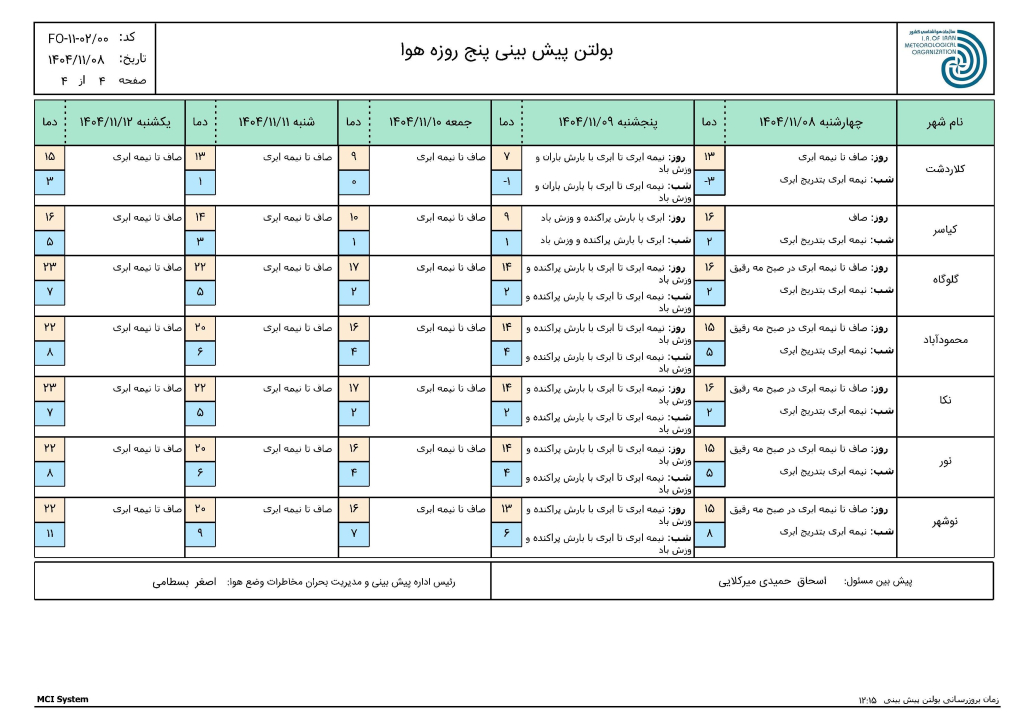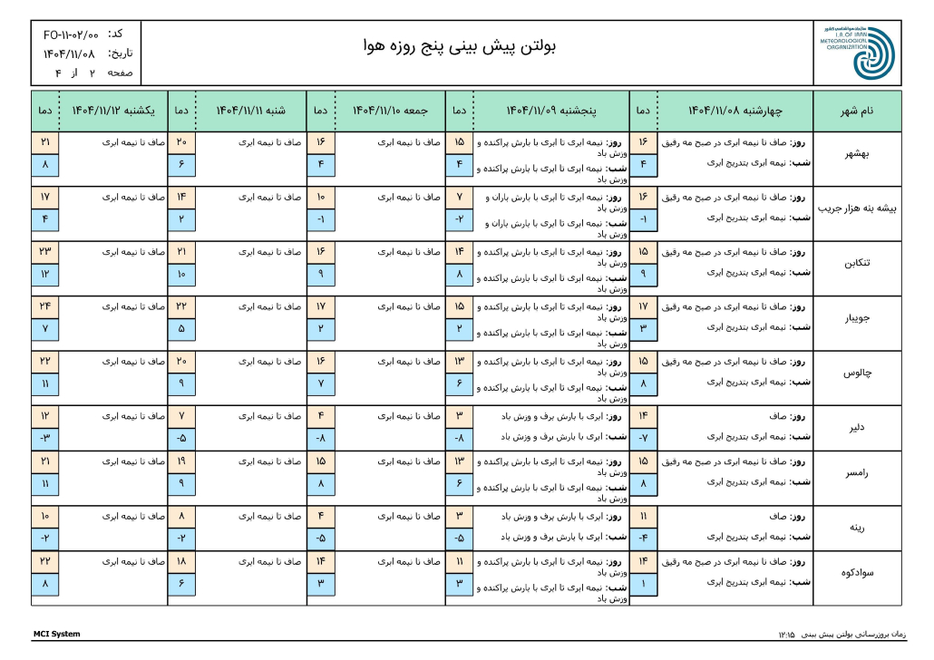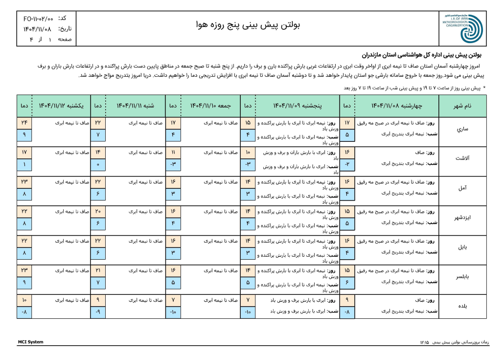 پیشبینی ۵ روزه شهرستان های مازندران – چهارشنبه ۸ بهمن ۱۴۰۴