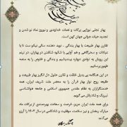 پیشاپیش در این هنگامه بی بدیل خلقت و تقارن حلول دل انگیز بهار طبیعت و طلیعه روح نواز بهار قرآن را به محضر ملت شریف ایران، همه خدمتگزاران به نظام مقدس جمهوری اسلامی و جامعه هواشناسی تبریک و شاد باش می گویم.