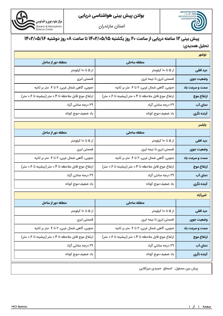 مسئول روابط عمومی هواشناسی مازندران: علاوه بر این بر اساس برنامه ریزی انجام شده، کارشناسان سازمان سازمان هواشناسی کشور و اداره کل هواشناسی مازندران در بخش های مختلف خبری صدا و سیما نیز آخرین تغییرات جوی مناطق مرتبط با پیاده روی اربعین را اطلاع رسانی می کنند.